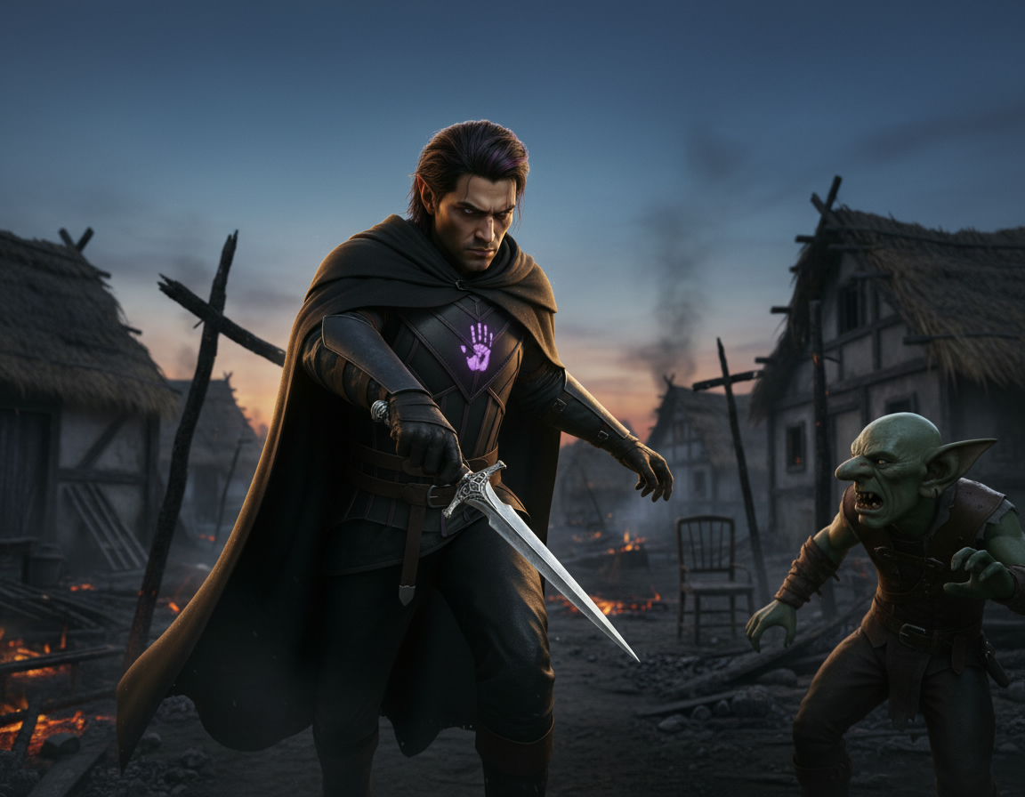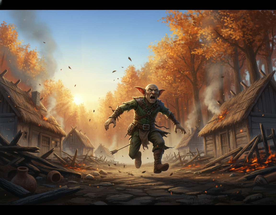 The very air of Wayrest was a lament. Most of the humble cottages, once hearths of warmth and life, now stood as charred husks, skeletal fingers reaching towards a desolate sky. It was a silence that screamed of violation, a landscape of ruin. With practiced caution, the adventurers fanned out, each seeking advantage in the haunting desolation. Radahn, a creature of stealth, melted into the shadows beside the nearest ruin, his bow already taut, an emerald predator in waiting. Adaelliyn, her blue hair a vibrant splash against the muted tones of destruction, found cover behind a crumbling wall, her own deadly aim poised. Kaelen, however, with the unwavering courage of a lioness, strode boldly into the town's heart, her senses alight, challenging the silence itself. Drayfis, ever cautious, followed a tense ten paces behind, his hand hovering over his arcane foci, his movements deliberate, his every nerve screaming caution. Yet, even their combined vigilance proved insufficient; the insidious quiet of the abandoned hamlet was a deception. For the ruins were not empty, and their entrance, however careful, had been noticed. From the skeletal remains of homes, from behind crumbling walls and burnt-out windows, the crude, chittering forms of goblins emerged, their guttural battle cries preceding a veritable rain of jagged arrows.